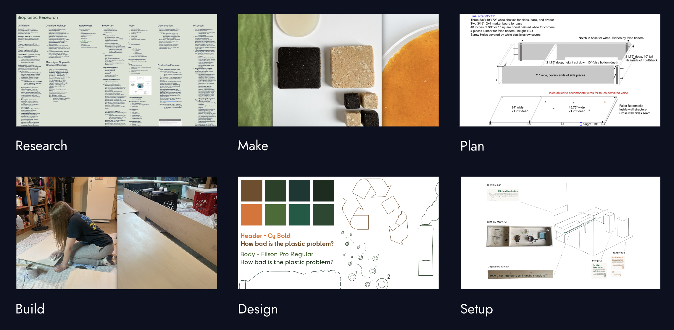My research began by doing a deep dive into how petroleum-based plastic is produced, used and broken down as well as how plastic impacts the environment. Next, I researched the production, lifecycle and environmental impact of different biodegradable bioplastics. Once I discovered a few different types of bioplastics that were the most sustainable throughout their lifespans and were easy to make, I began making the different materials. After weeks of experimentation, I found a recipe for a type of agar-based bioplastic that I believed would be the best type of bioplastic to showcase. I began to dissect the steps within the making process to determine the best way to display each step in an interactive way. After the research portion of the project was complete, I filtered through the knowledge I gained in order to put the most important pieces of information into the exhibit’s posters, signs and interactive table display.