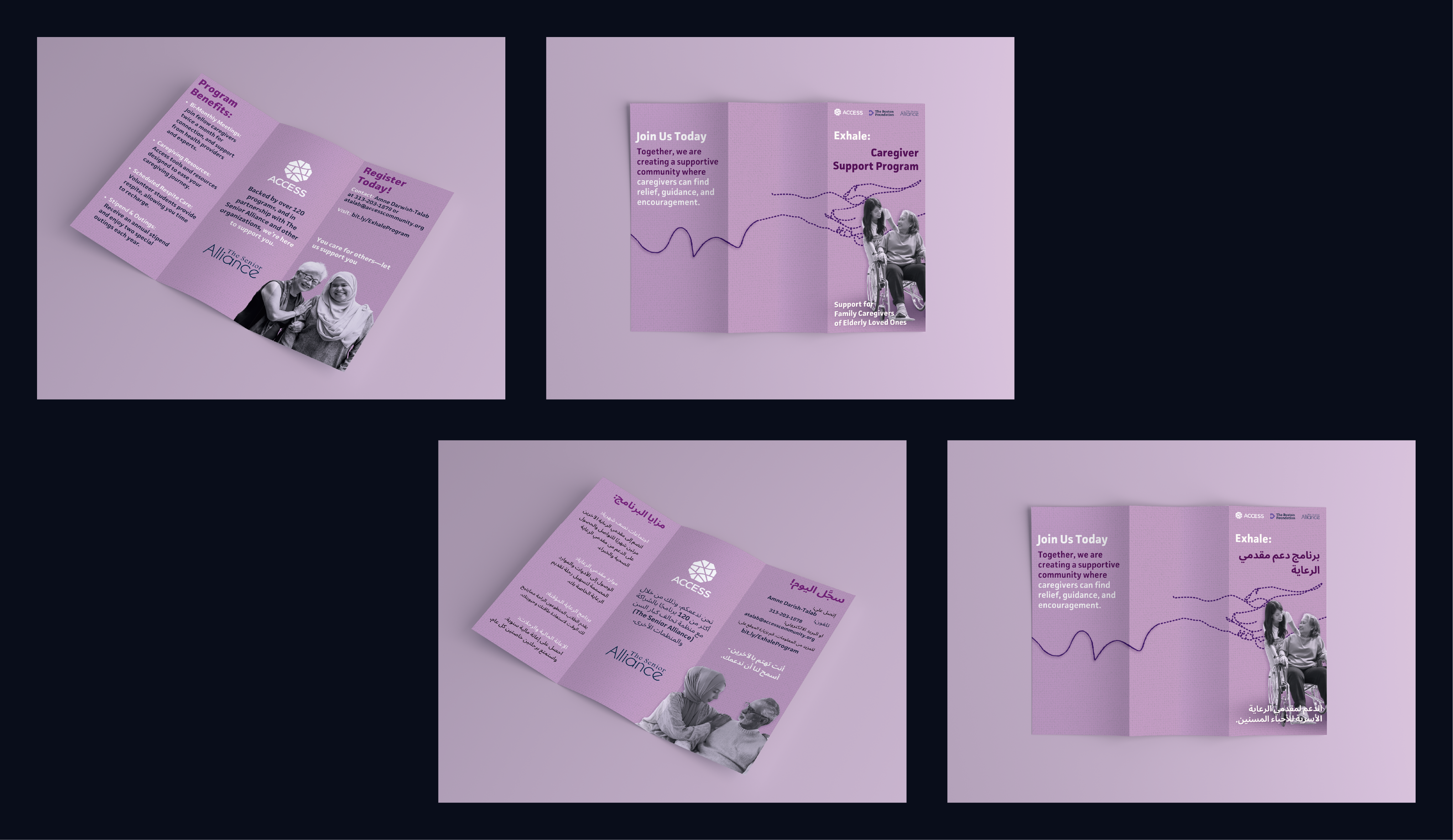 Caregiving for elderly loved ones is often a thankless mentally and physically exhausting job. These individuals give so much for the ones they care for but often do not get the support they need. This is why the Social Services Department at ACCESS (Arab Community Center for Economic and Social Services) started a caregiver support program called the EXHALE Program. This program was designed to empower caregivers of elderly loved ones by providing caregivers with the resources, support, and connection they need. With the support of my colleague Jacob, I developed branding specially for the audience of this support group. I created a brand for the support group that reflects the warm and compassionate nature of the program. By centering the branding around crafts such as sewing and embroidery, my hope was to create a brand that mirrors the feeling of connection between friends in the support group with the connection which is often felt when doing crafts with or for others within the home. Using this branding, I developed a variety of marketing assets such as social media graphics, posters, banners and flyers to get the word out about this amazing program.